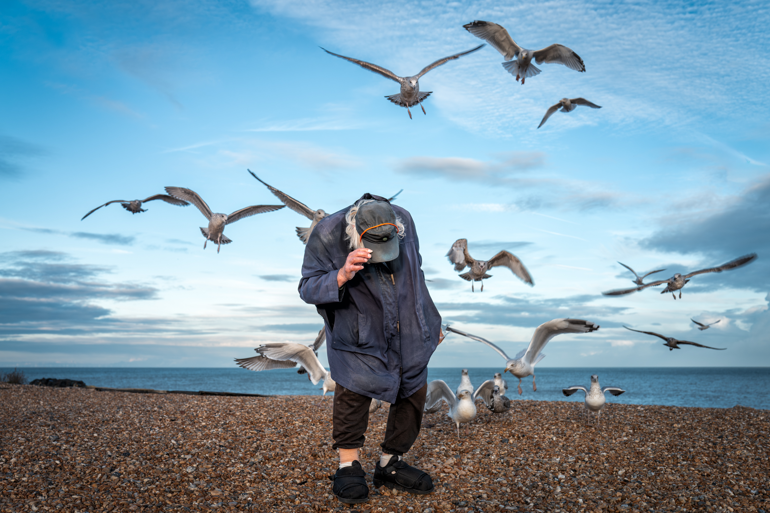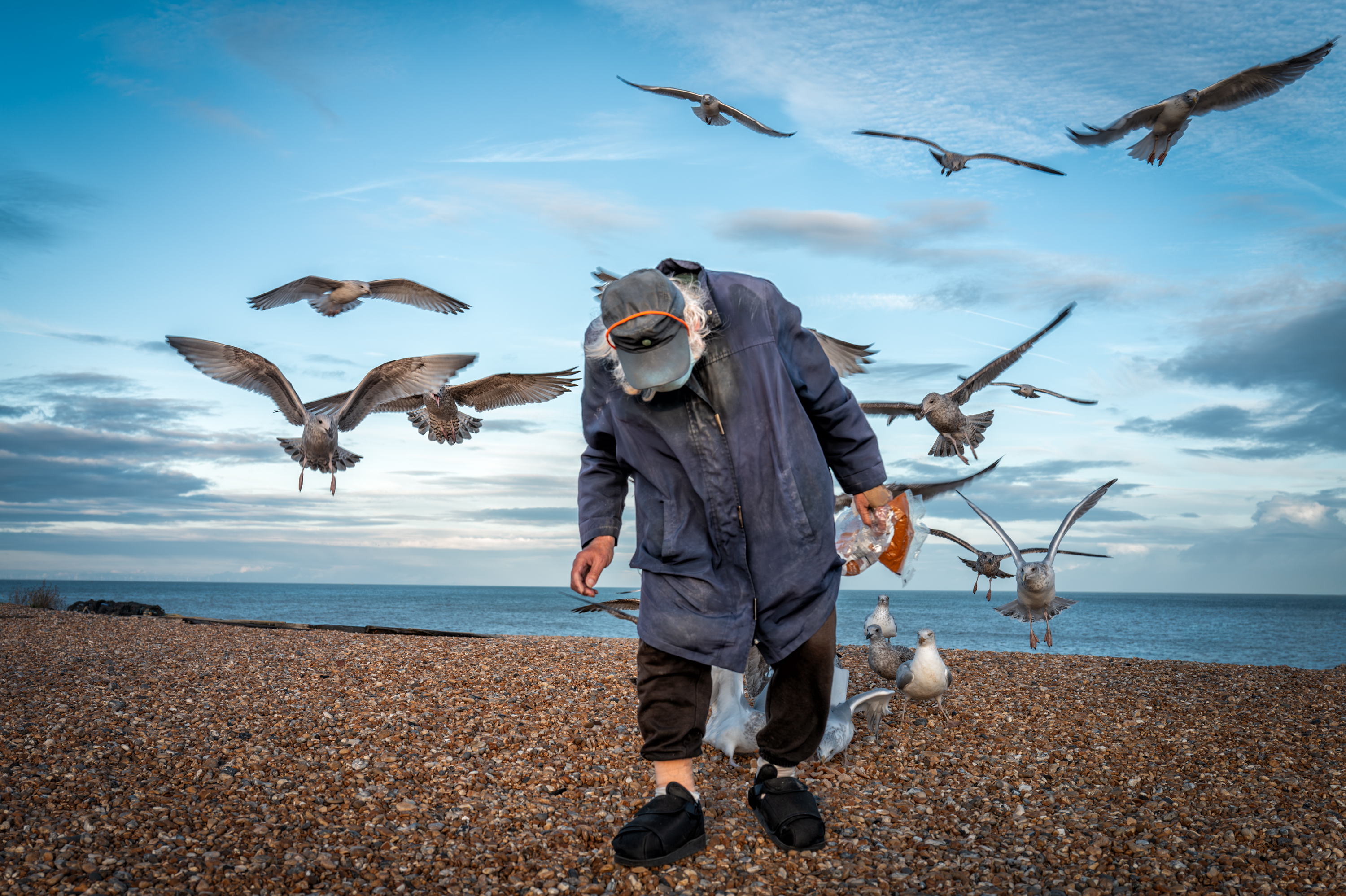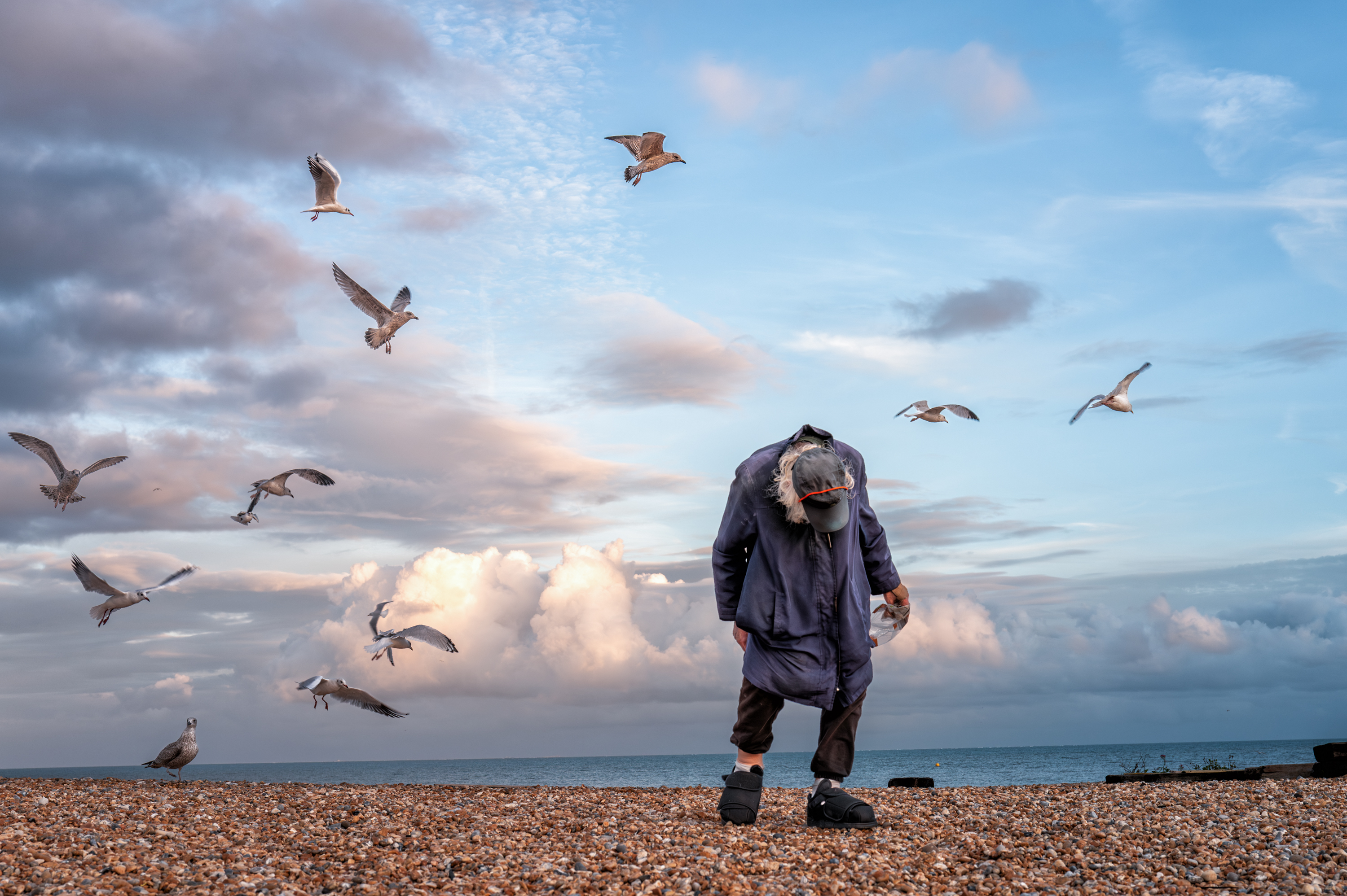 Fred Upton (ex fisherman and ferry worker) is a regular sight on Walmer beach. He visits most days (weather permitting) with a bag of wholemeal bread for the gulls and a flask of water for himself. For many locals he is the symbol of the beach. These shots were made with Fred's permission at two of his regular meetings with the birds in September 2024 and October 2025.