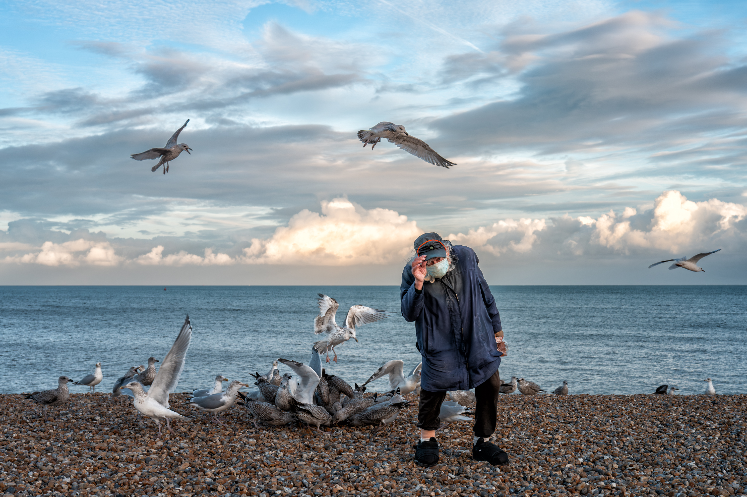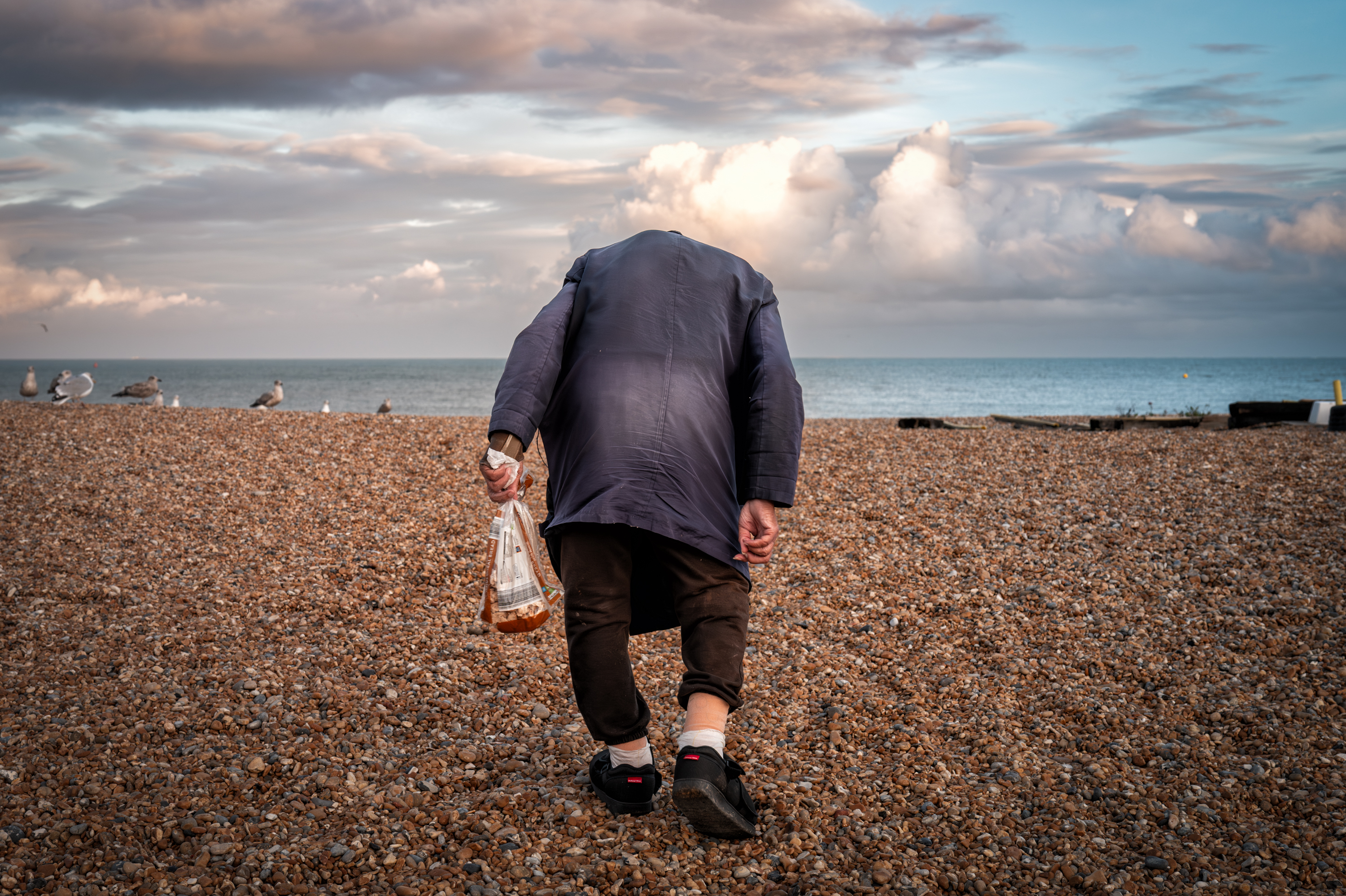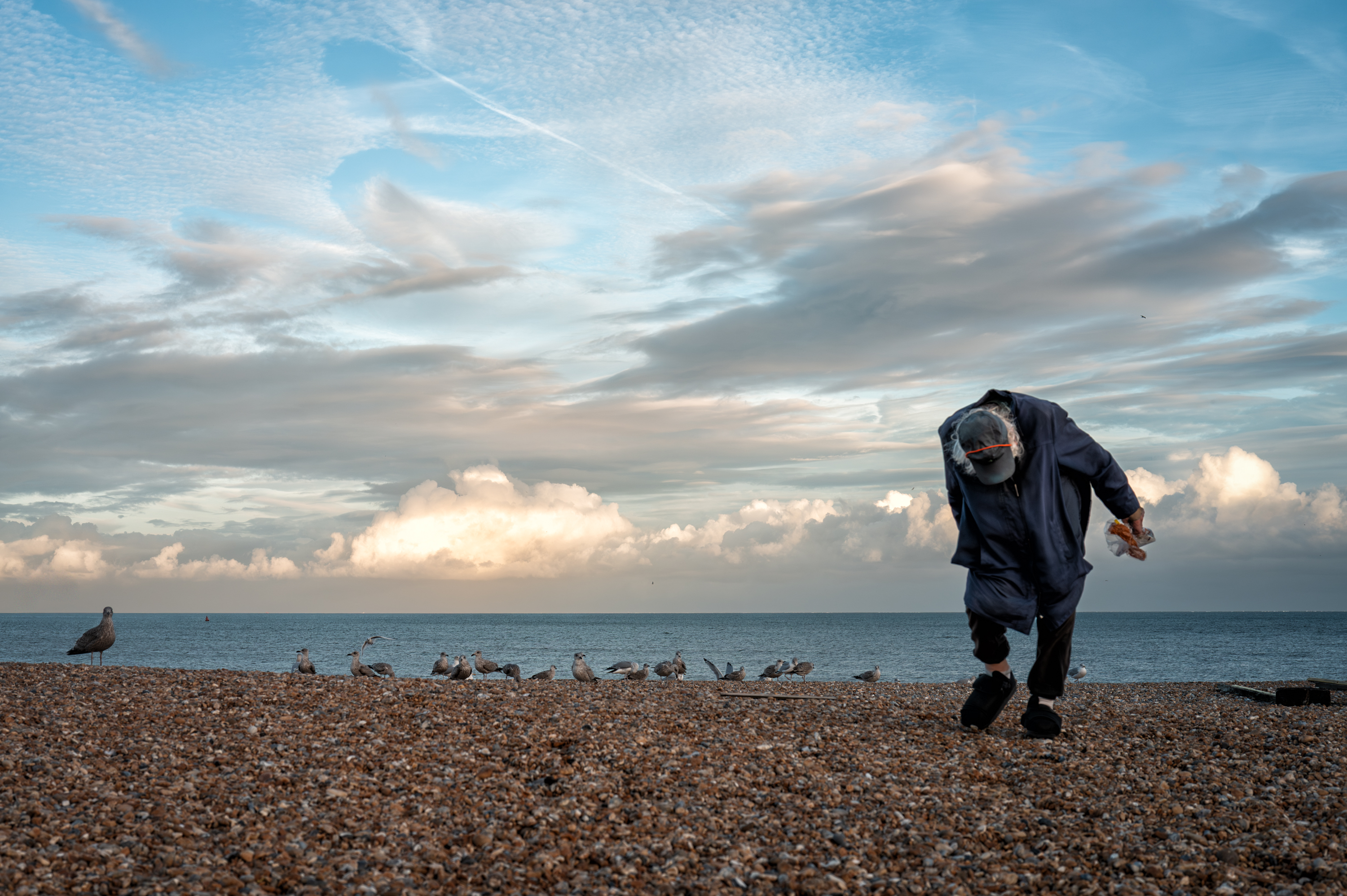 Fred Upton (ex fisherman and ferry worker) is a regular sight on Walmer beach. He visits most days (weather permitting) with a bag of wholemeal bread for the gulls and a flask of water for himself. For many locals he is the symbol of the beach. These shots were made with Fred's permission at two of his regular meetings with the birds in September 2024 and October 2025.